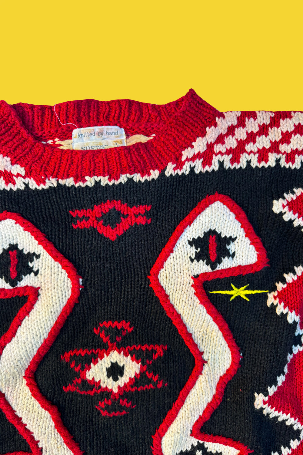 TITLE: HAND KNIT RED AND BLACK SWEATER