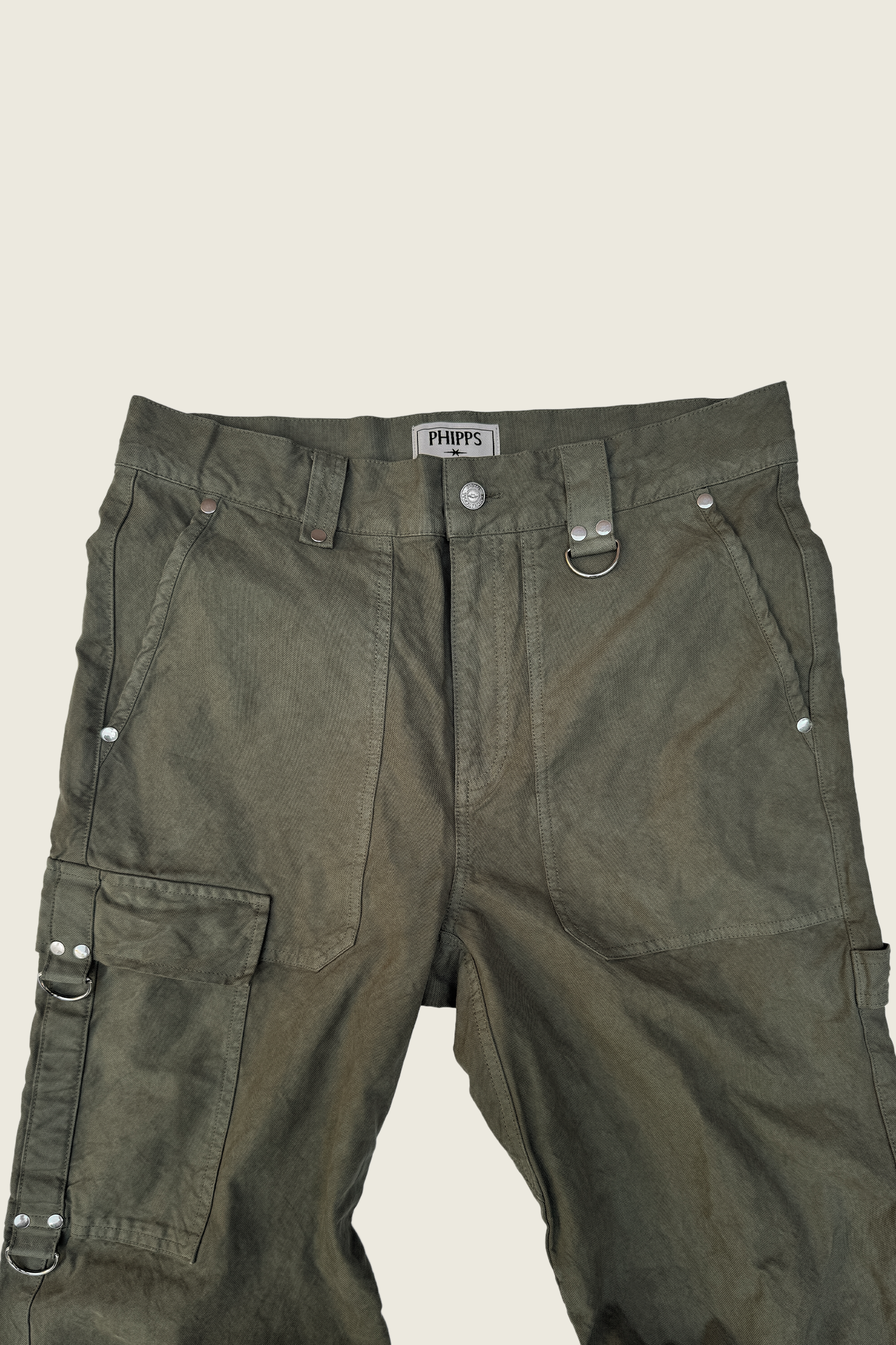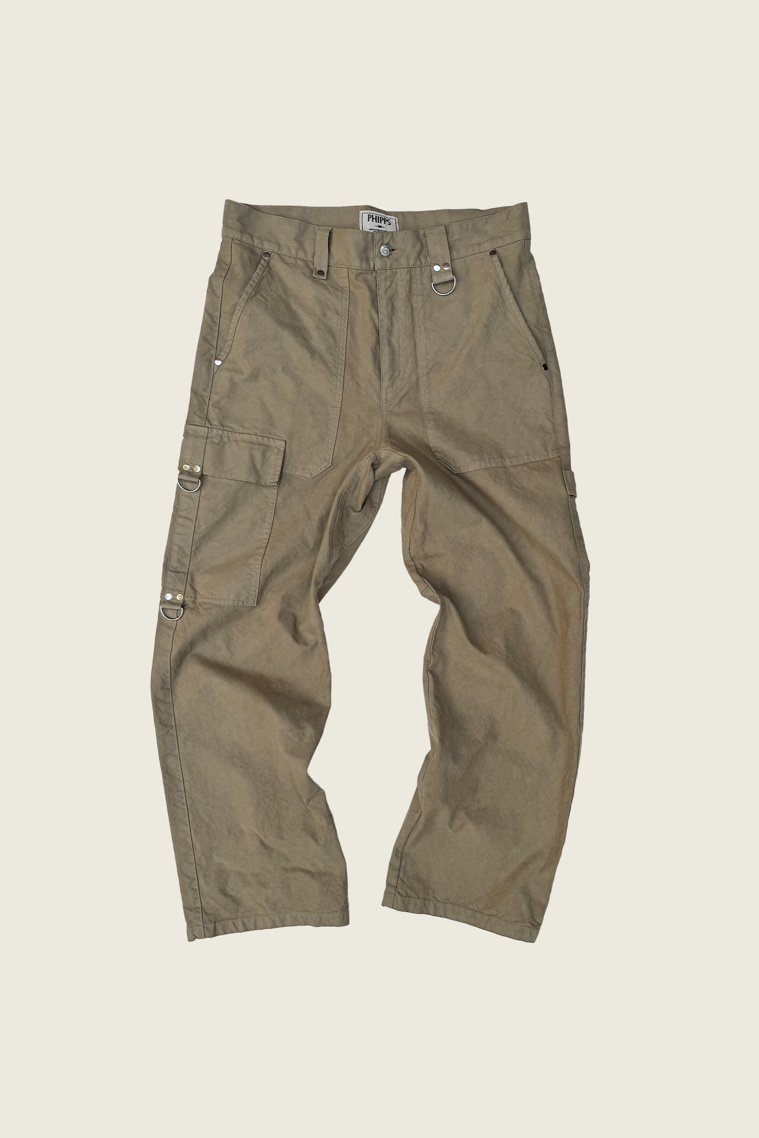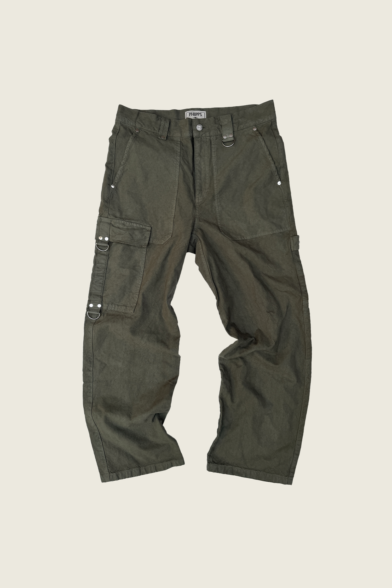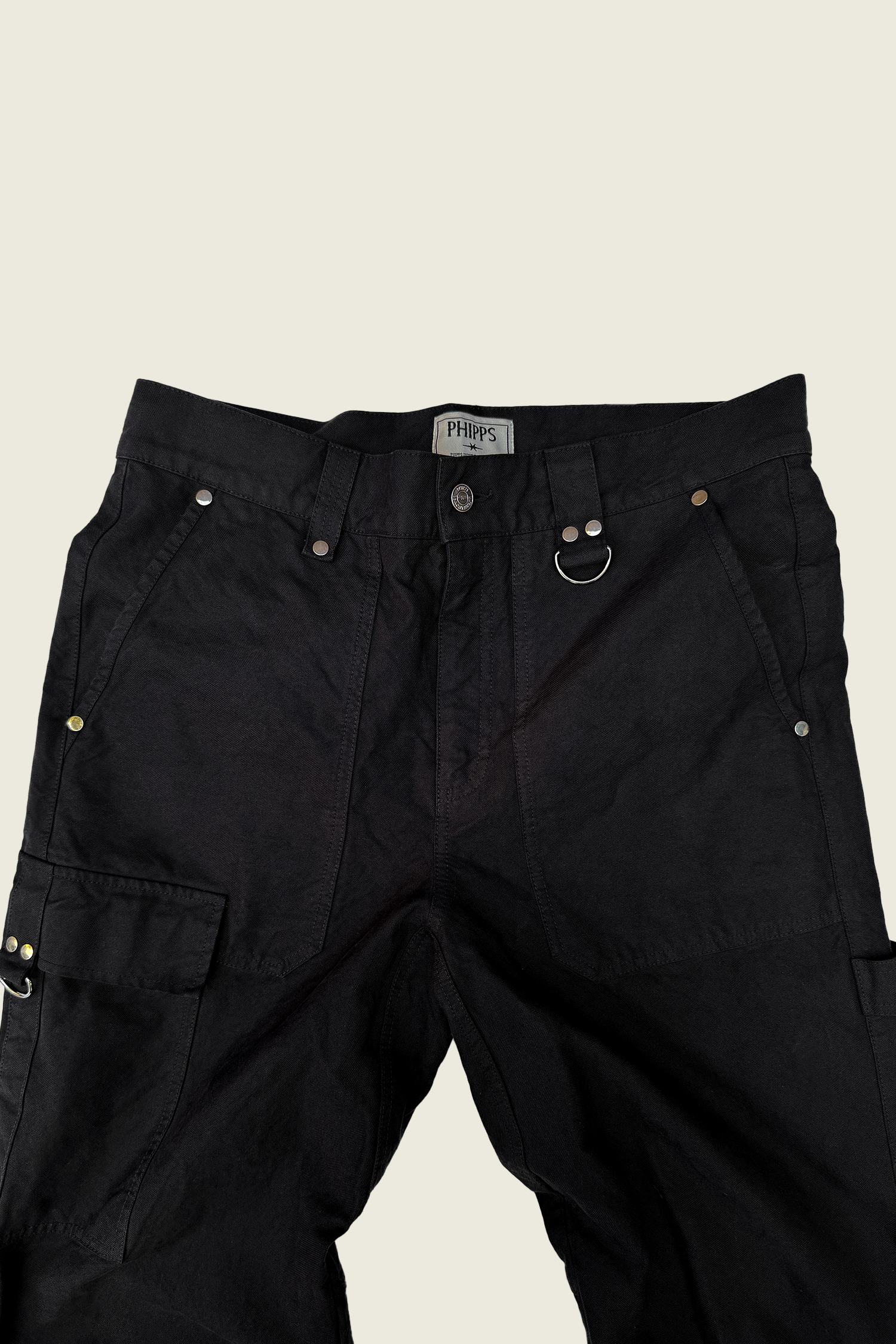 High-waisted with a relaxed fit and lightly tapered leg, finished with patch pockets, a cargo pocket, and signature PHIPPS details: silver studs, reinforced belt loops, and the D-ring. A proven workhorse.