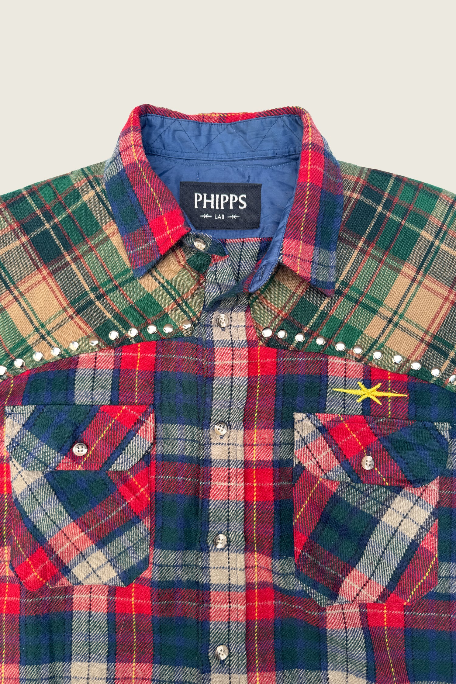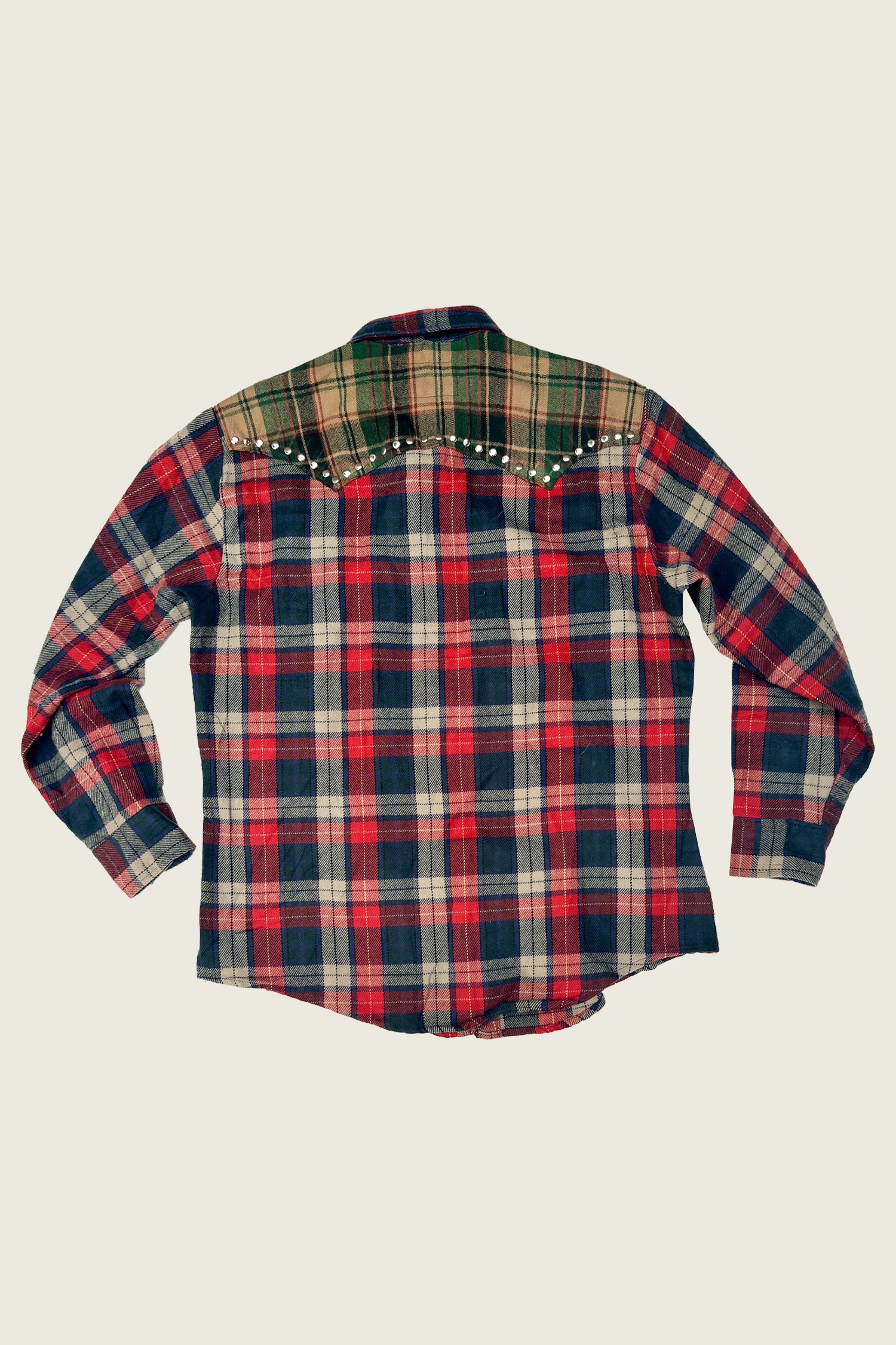 The Studded Multi-Plaid Shirt takes a timeless flannel to the next level. Upcycled vintage flannels are reworked with western yoke details in contrasting plaids and finished with hand-applied silver studs for a bold, rugged edge. Classic with a kick. Each item is uniquely upcycled from vintage stock seamlessly blending heritage craftsmanship with modern functionality.