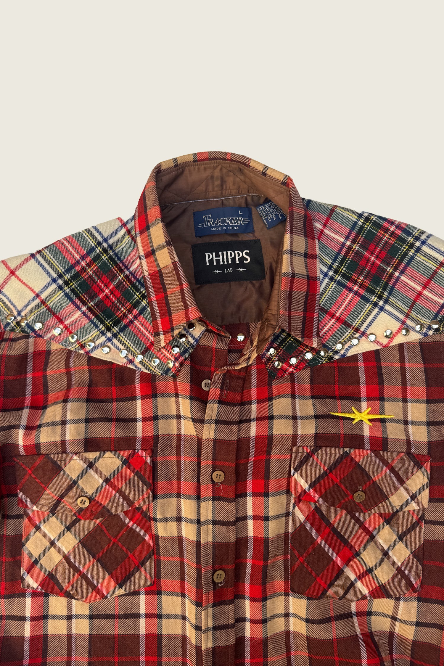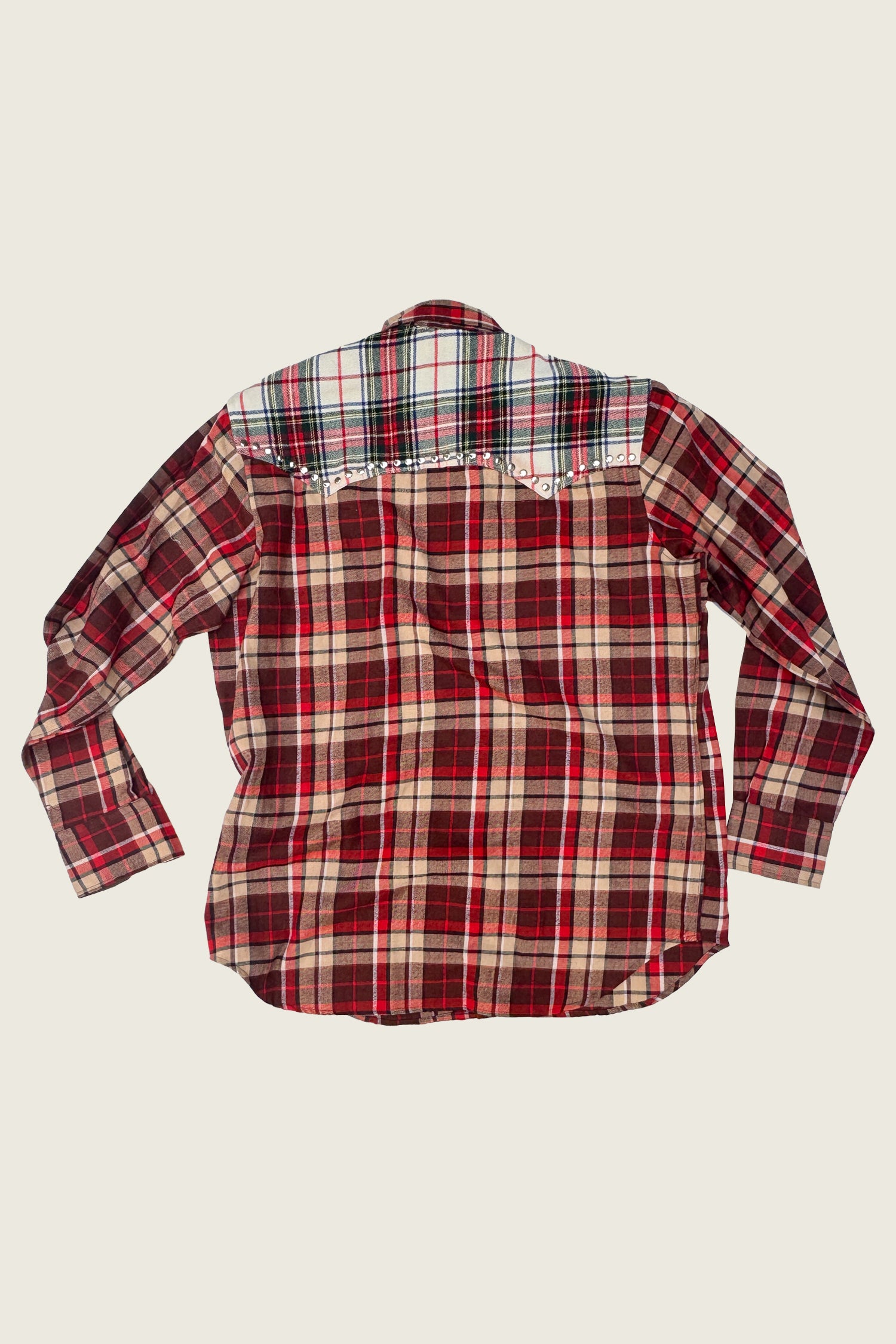 The Studded Multi-Plaid Shirt takes a timeless flannel to the next level. Upcycled vintage flannels are reworked with western yoke details in contrasting plaids and finished with hand-applied silver studs for a bold, rugged edge. Classic with a kick. Each item is uniquely upcycled from vintage stock seamlessly blending heritage craftsmanship with modern functionality.